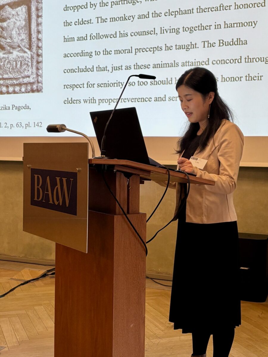 The narrative of the Buddha’s past life as a kapiñjala (partridge) is well known across various Buddhist traditions. Central to this jātaka tale is the theme of mutual veneration among animals based on age, presented as a moral lesson for monastics: to respect and honor senior members of the sangha. Notably, among the extant versions of this narrative, only the one preserved in the Śayanāsanavastu of the Mūlasarvāstivādavinaya features four animal characters – the partridge, hare, monkey, and elephant. In contrast, other versions from schools such as the Theravāda, Mahīśāsaka, Mahāsānghika, Dharmaguptaka, and Sarvāstivāda include only three animals: the partridge, monkey, and elephant — omitting the hare. It is especially significant that both three- animal and four-animal variants are visually represented in the cave paintings of Kucha, an important Buddhist center along the Silk Road. In Kizil Cave 114, for instance, three animals are depicted standing atop one another in accordance with age, aligning with the abbreviated version of the tale. In contrast, Kizil Cave 58 and Kumtura Cave 63 depict four animals, with the hare carried under the monkey’s arm – reflecting the Mūlasarvāstivāda version. Representations of the Kapiñjalajātaka also appear widely in the Himalayan region, particularly in narrative thangkas. As these regions adhere to the Mūlasarvāstivādavinaya, the depictions consistently include all four animals. By examining both textual and visual versions of the Kapiñjalajātaka from Kucha to the Himalayas, this study highlights the intersection of artistic transmission, sectarian affiliation, and regional Buddhist development. The presence or absence of the hare offers an illustrative case for tracing the influence of monastic lineages and their associated narrative traditions across time and space.